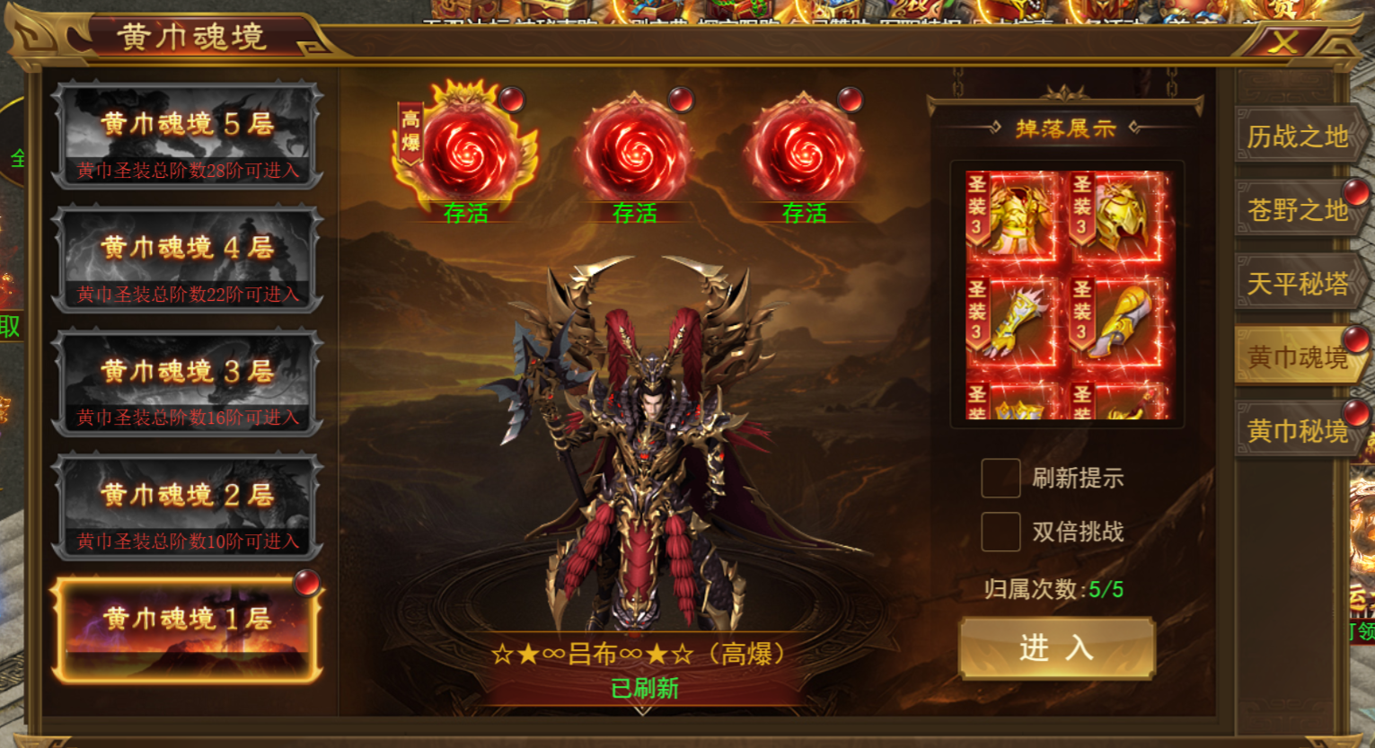 b.魂境有5层,需要黄巾圣装达到对应阶数才可以进入